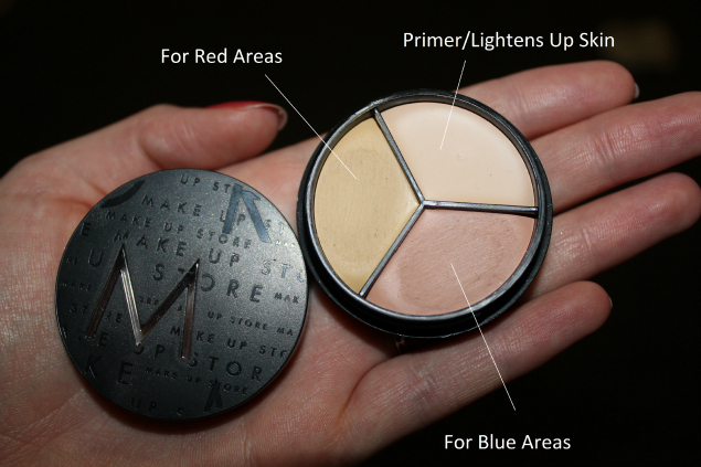 - The orange-red concealer covers blue areas like dark rings under the eyes.